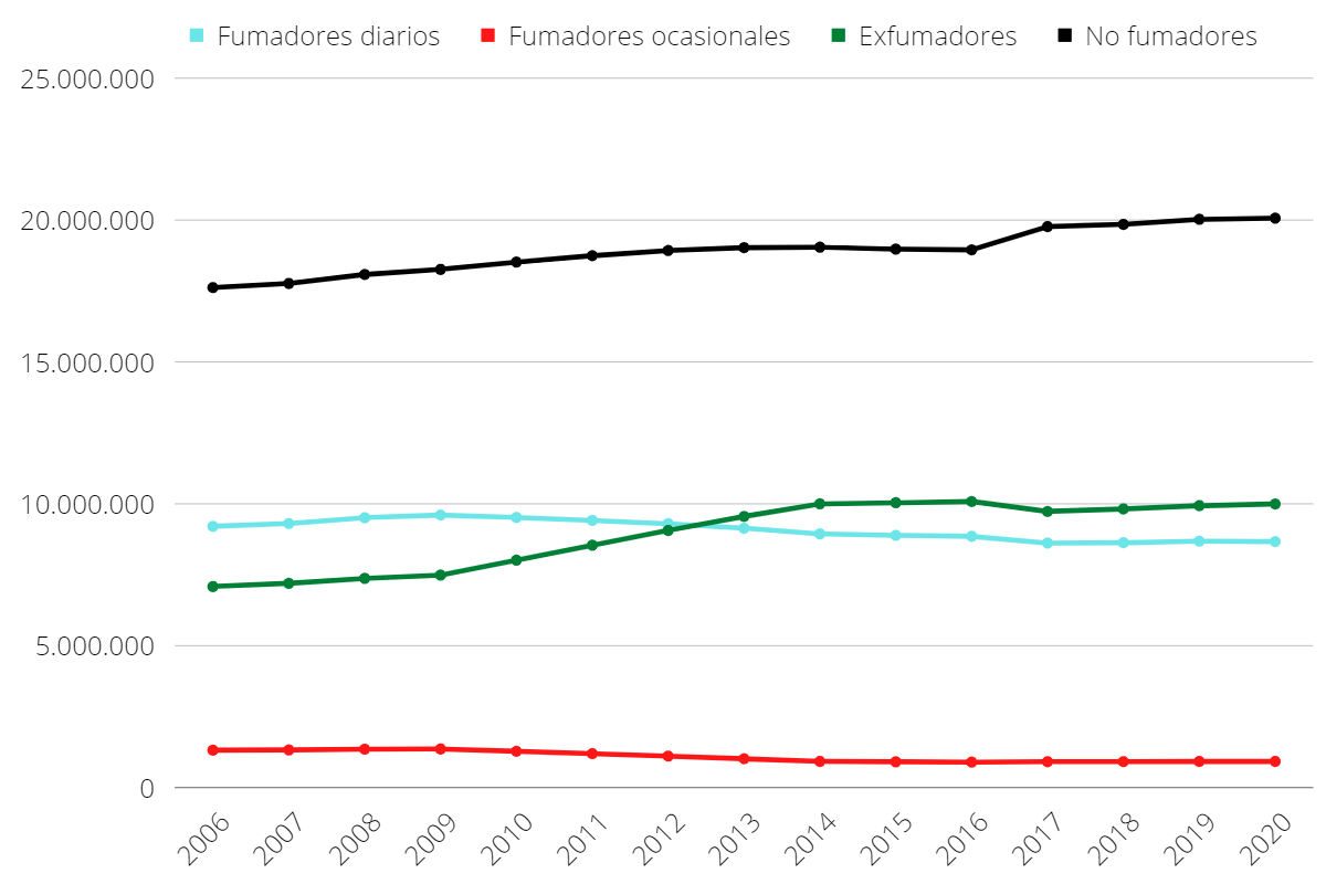 La cifra de personas mayores de quince años que afirma fumar a diario asciende en España a alrededor de 8,6 millones de personas, mientras que la de no fumadoras asciende hasta casi 20 millones de personas.